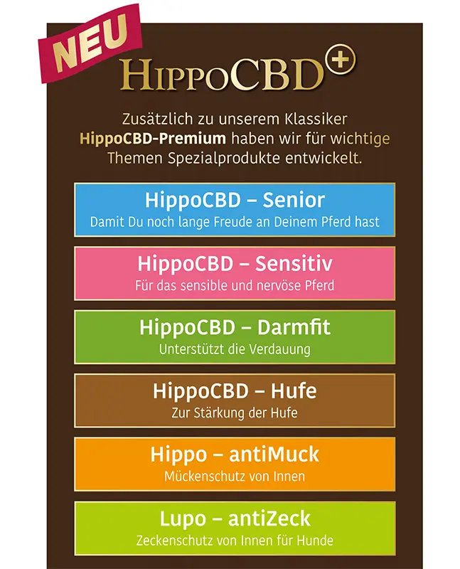 Mit dem Plus für Dein Pferd: Hippocbd Plus Kräuter – zusätzlich zur großzügigen Grundversorgung von 100 mg/Tag noch genau die Kräuter für Dein Problem.