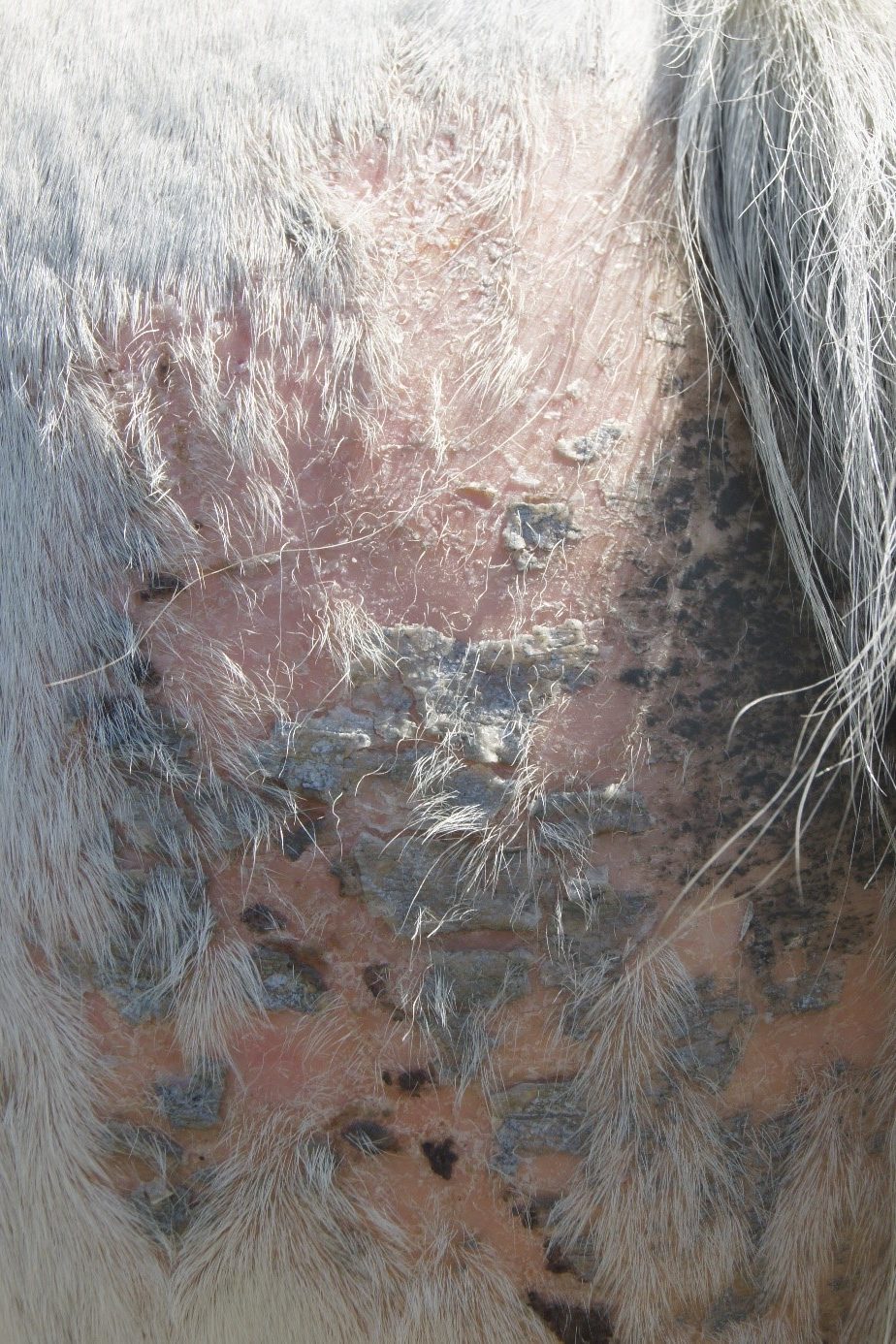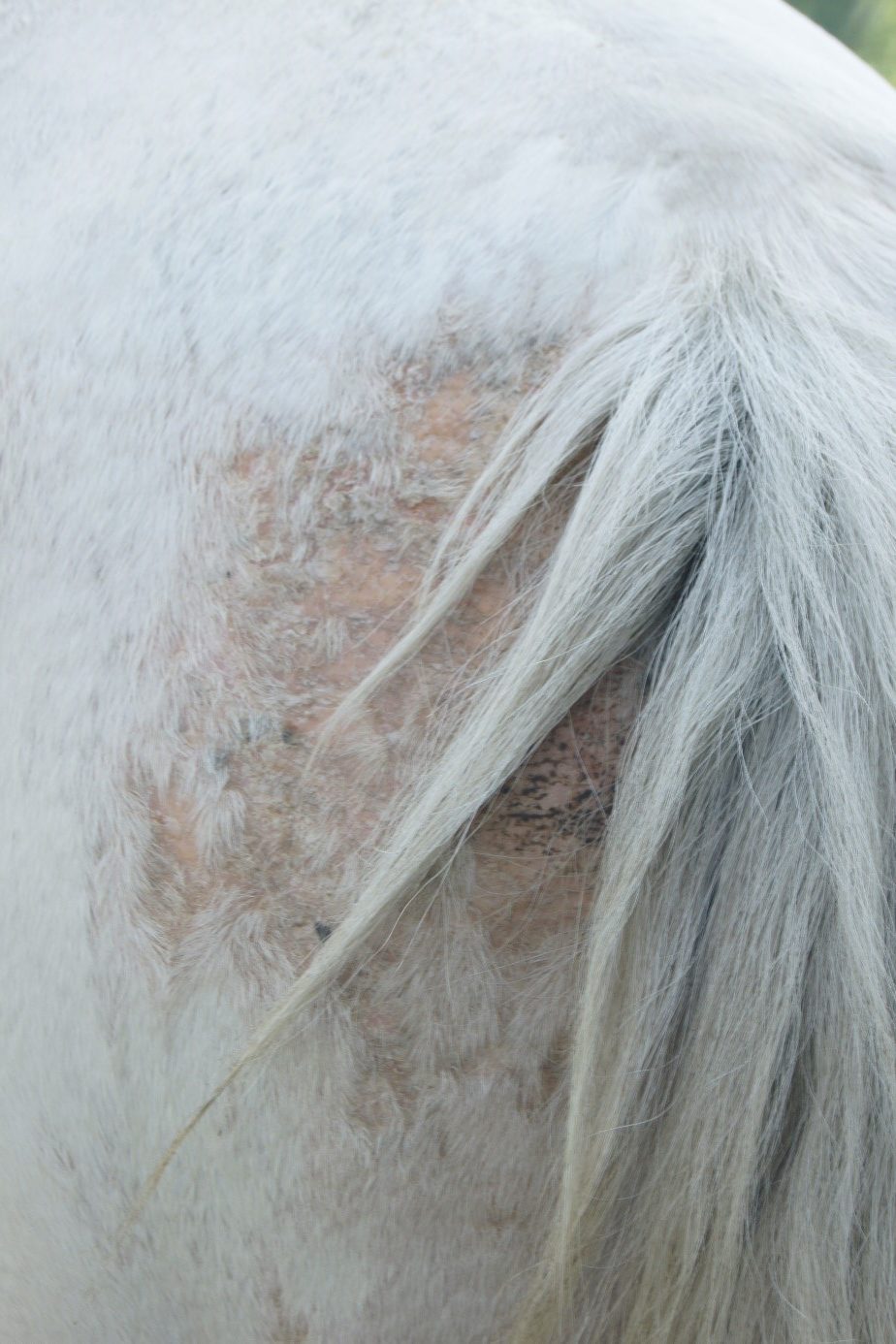 Ich habe kürzlich eine Scheckstute (9 Jahre) gekauft, natürlich mit Rückgaberecht, denn sie war auf allen Oberschenkeln und an der Nase kahl. Teilweise sogar nässelnd. Der Juckreiz war so heftig, dass sie sich in kurzen Abständen wälzte, egal wo sie gerade stand. Eincremen und Einsprühen lies sie sich nicht und war auch sehr unzugänglich.