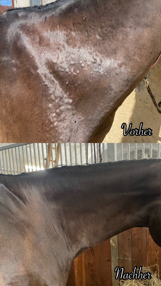 Das hellbraune Pferd (Christo) wurde zuvor mit den Hippocbd Aroma-Pellets Premium gefüttert, weshalb wir erst am Tag des „Nachherfotos“ von Pablo mit der Fütterung des Antimucks bei ihm begonnen haben. Das Vorher-Bild von Christo ist am Tag des Nachher-Bildes von Pablo entstanden. An diesem Tag der Insektenbefall besonders hoch. Diese konnten Pablo aber dank dem Antimuck nichts mehr anhaben. Einige wenige Tage später ist das Nachher-Bild von Christo entstanden – wieder einfach nur ein tolles Ergebnis.