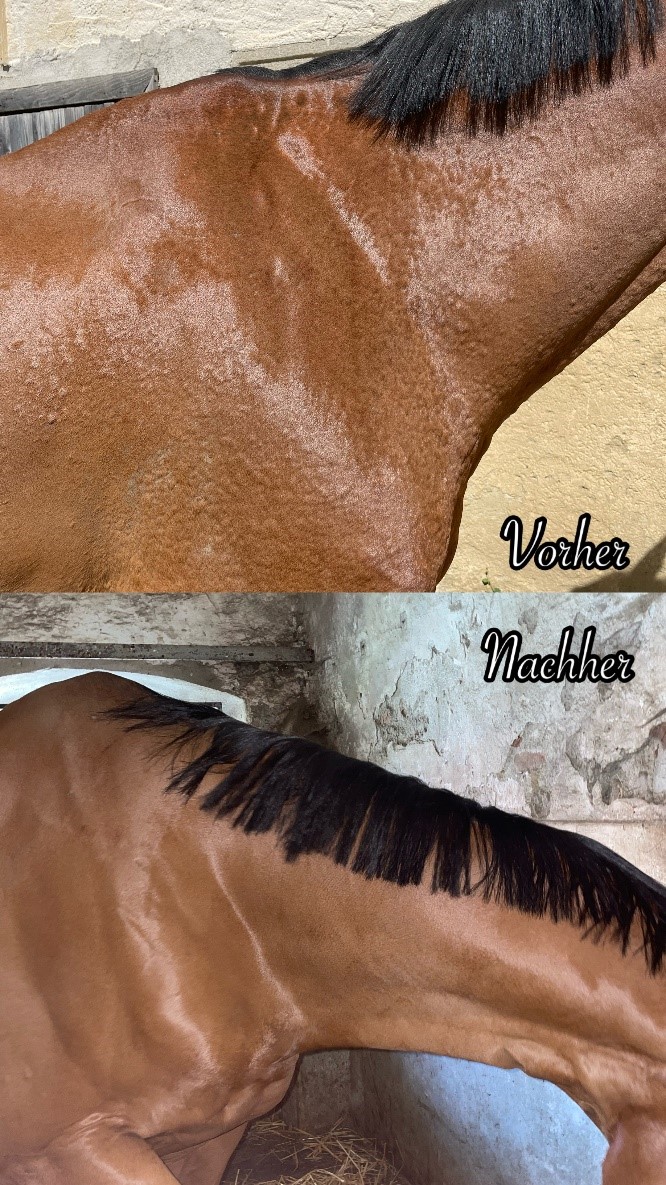 Schon nach 5 Tagen eine wahnsinnige Verbesserung,.. Trotz Wetterwechsel kaum Kotwasser, ich bin begeistert. Popo sieht sowas von gut ausich bin so glücklich. Gerade in den Wintermonaten war es ein großer Aufwand das Pferd sauber und trocken zu halten.